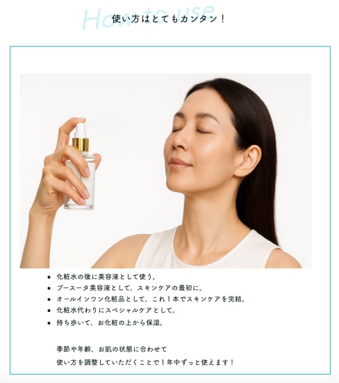 洗顔後に顔全体に数プッシュ後手で薄く広げて下さい。化粧水代わりに又は乳液やクリームの前に使用下さい。デコルテやボディにも使用可能です。