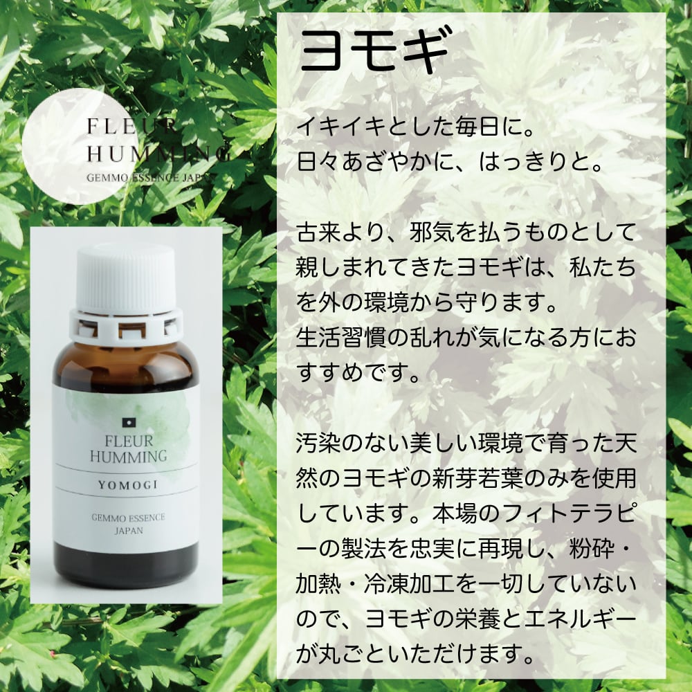 15年以上に渡る植物幹細胞の研究とジェモセラピー開発のノウハウを持つフランスのエルビオリス社と共同開発した、国産のジェモセラピー「フルーハミング(通称:和ジェモ)」は、汚染のない美しい場所で摘み取られた野生の植物や有機栽培されたハーブの、新芽やつぼみを原料としています。