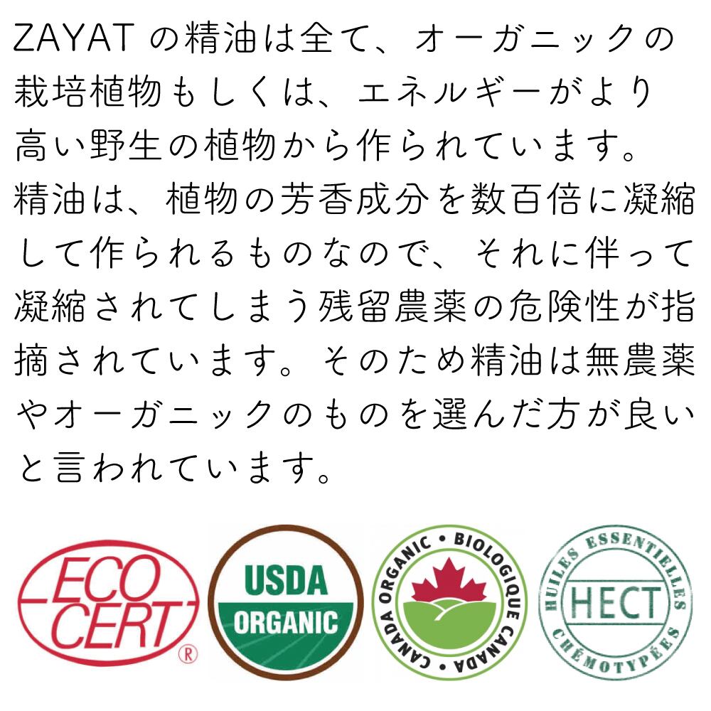 ◼︎ZAYATの精油は全て、オーガニックの栽培植物もしくは、エネルギーがより高い野生の植物から作られています。精油は、植物の芳香成分を数百倍に凝縮して作られるものなので、それに伴って凝縮されてしまう残留農薬の危険性が指摘されています。そのため精油は無農薬やオーガニックのものを選んだ方が良いと言われています。