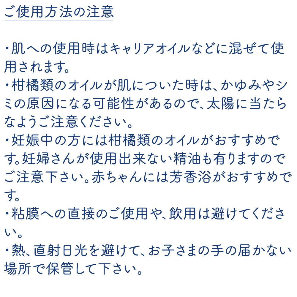 ・柑橘類のオイルが肌についた時は、かゆみやシミの原因になる可能性があるので、太陽に当たらなようご注意ください。