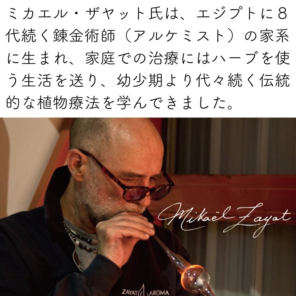 ミカエル・ザヤット氏は、エジプトに8代続く錬金術師(アルケミスト)の家系に生まれ、家庭での治療にはハーブを使う生活を送り、幼少期より代々続く伝統的な植物療法を学んできました。