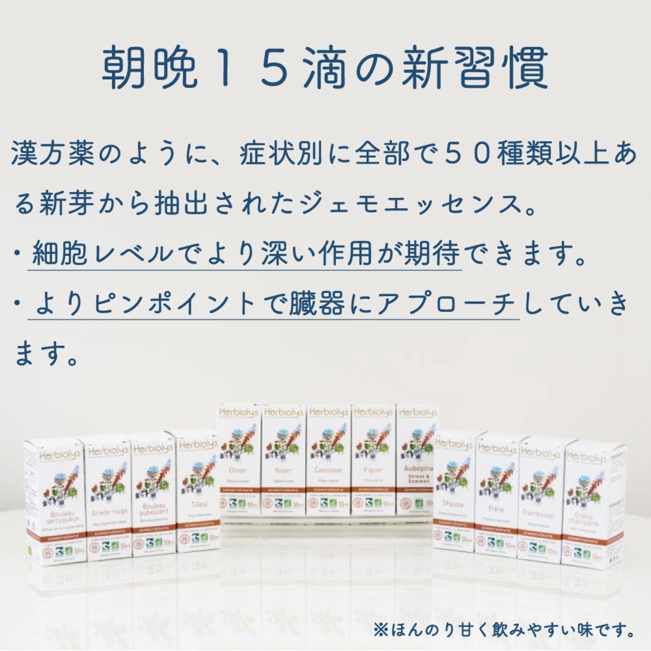 ※ ジェモセラピー は、 サプリメント のように飲み続ける必要がなく、症状が治まれば飲むのをやめて頂いてかまいません。