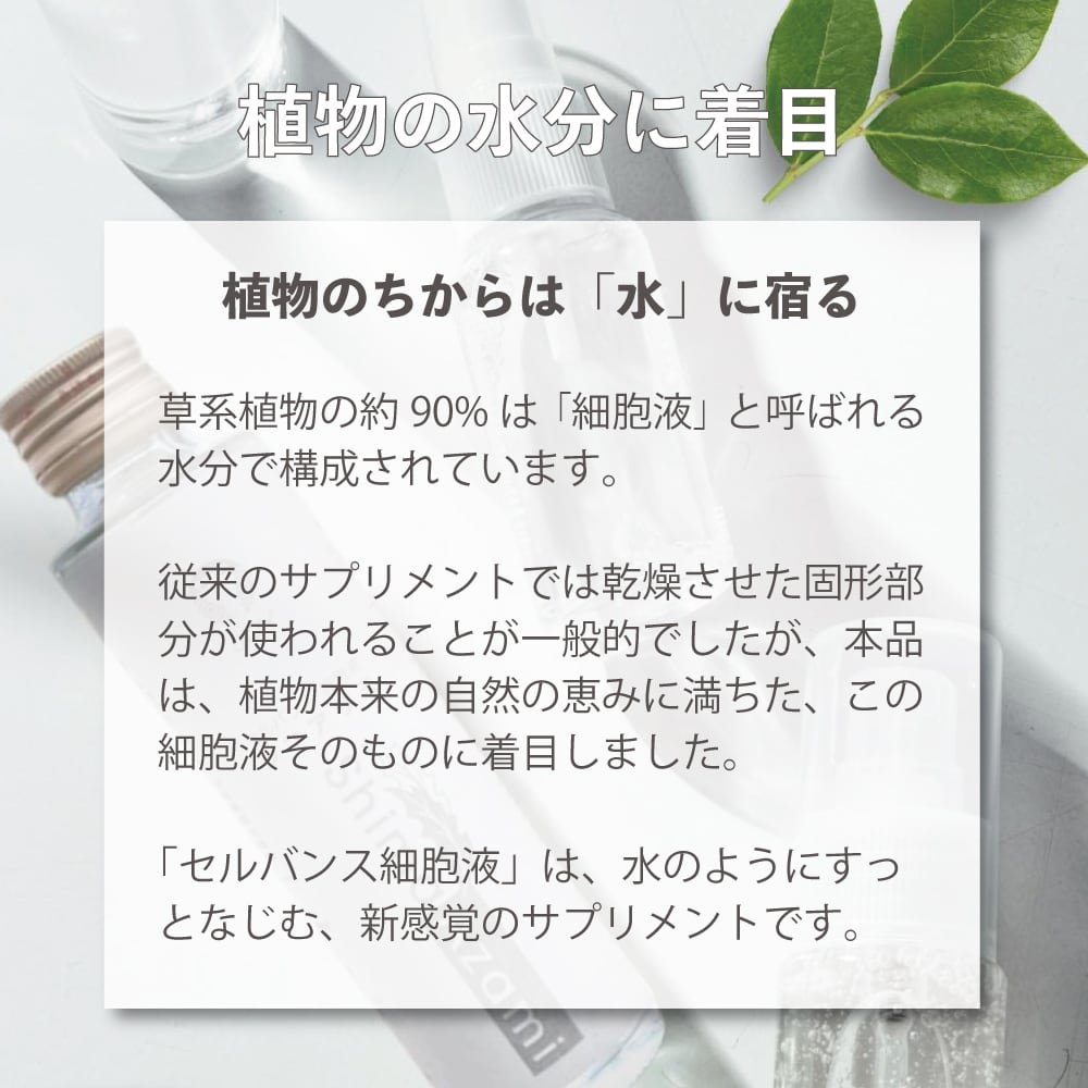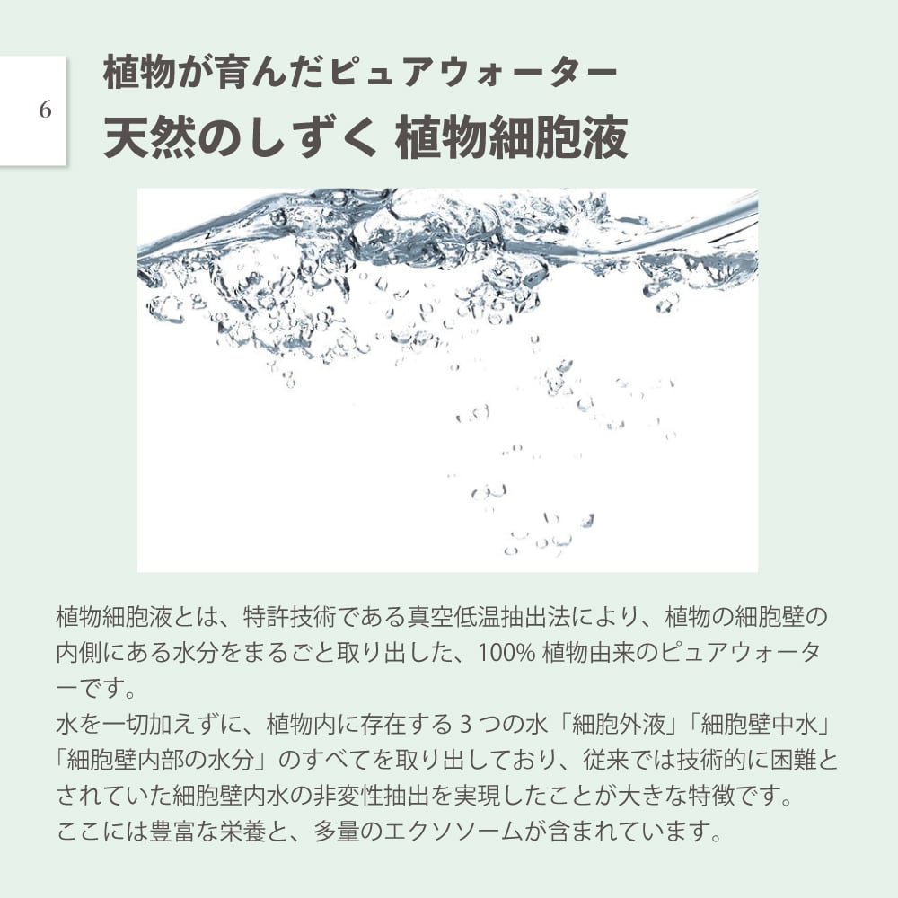 植物細胞水から抽出された“植物由来成分(エクソソーム様粒子)”を豊富に含む、これまでにない新しい発想のナチュラルドリンクです。