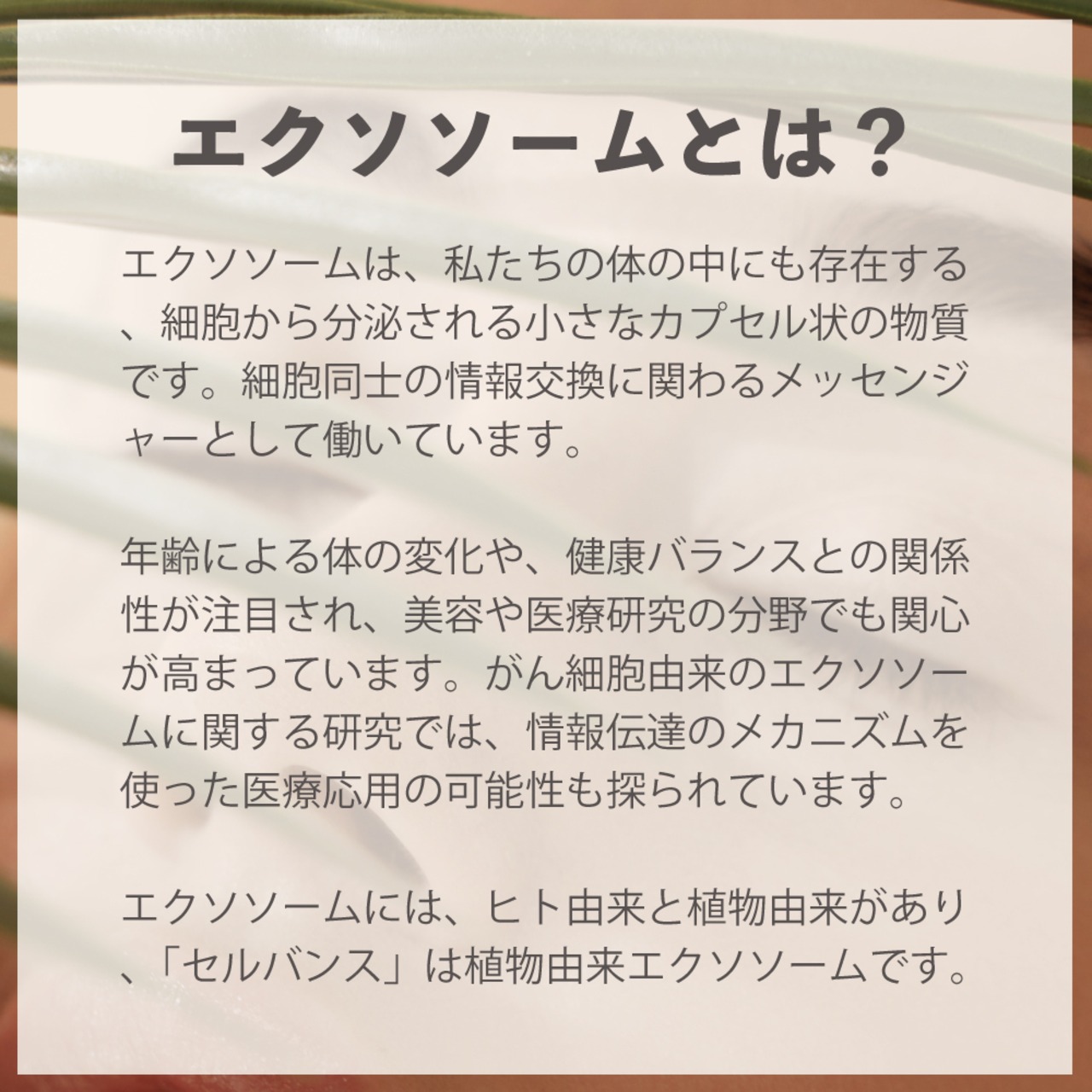エクソソームには、ヒト由来と植物由来があり、「セルバンス」は植物由来エクソソームです。