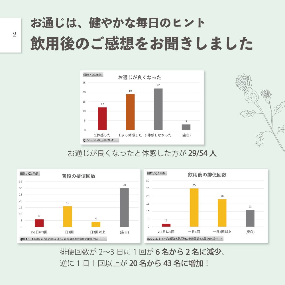 成人10名を対象に14日間継続して飲用後に腸内フローラ試験を行った結果、ビフィズス菌が1.9倍、アッカーマンシア菌が9.6倍と、数値に増加傾向が報告されています。