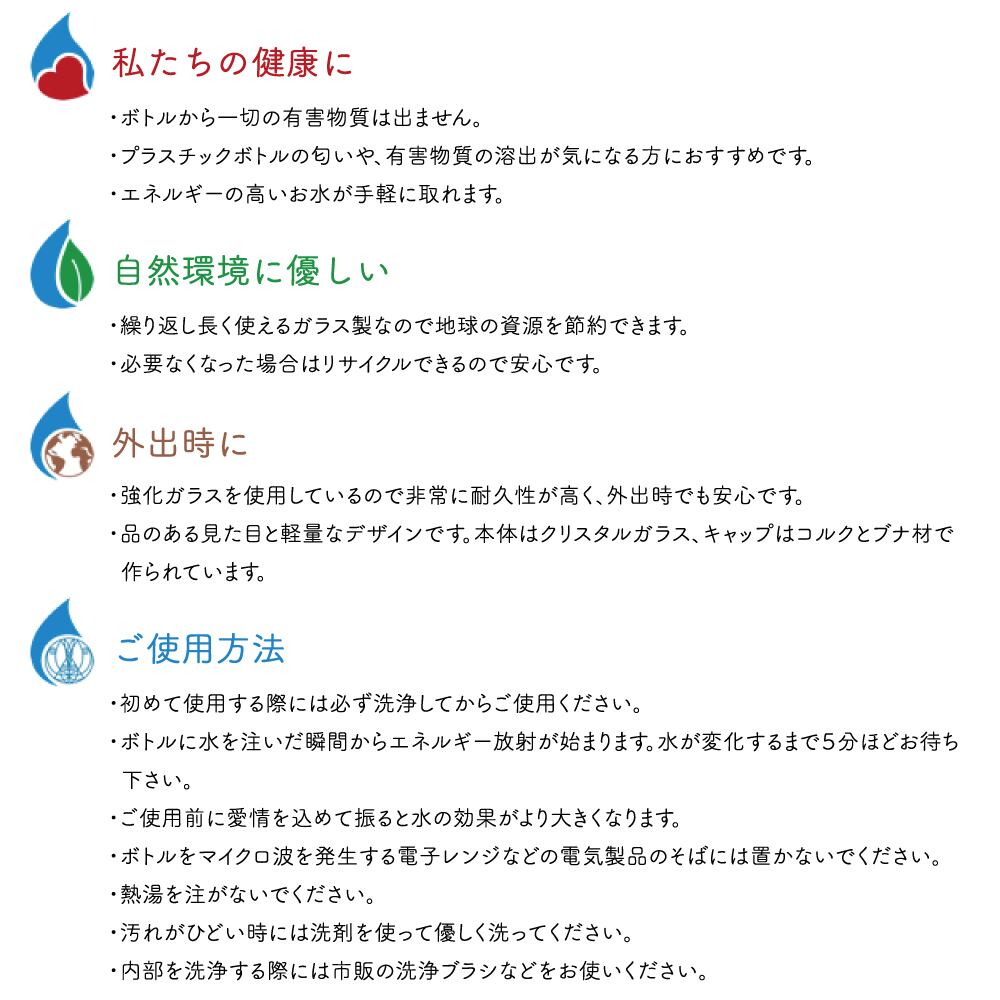 ・ボトルに水を注いだ瞬間からエネルギー放射が始まります。水が変化するまでに5分ほどお待ち下さい。