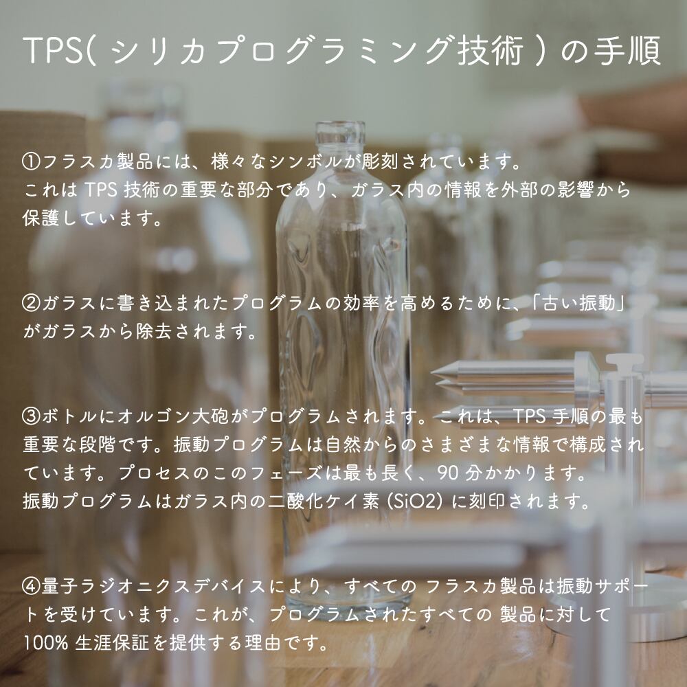 ③ボトルにオルゴン大砲がプログラムされます。これは、TPS 手順の最も重要な段階です。振動プログラムは自然からのさまざまな情報で構成されています。プロセスのこのフェーズは最も長く、90 分かかります。振動プログラムはガラス内の二酸化ケイ素 (SiO2) に刻印されます。
